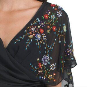 high front slit, bead embellished bodice, gathered design, fully lined, floral details