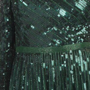 fully lined, one long sleeve, sequin and bead embellished mesh overlay