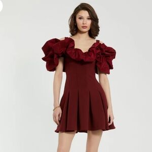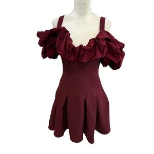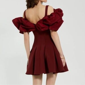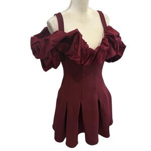 MAC DUGGAL Oxblood Crepe Godet Hem Mini Dress Faille Ruffle Shoulder NWT Size 6