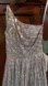 This stunning one-shoulder A-line gown is embellished with cascading diagonal rows of sequins and beads throughout the mesh overlay. The focal point of this gown is the beautiful bead work that lays at the top of the bodice. This gown also features a small sweeping train, and a dainty hand-beaded belt sits at the natural waist.