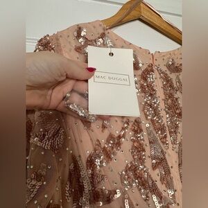 MAC DUGGAL Rose Gold Sequined faux wrap split long sleeve gown 16 NWT
