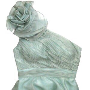 Mac Duggal pleated one shoulder dress with rosette flower detail.
