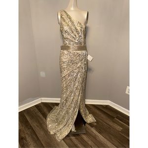 MAC DUGGAL SEQUINED ONE SHOULDER DRAPED LACE UP GOWN