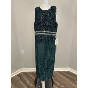 Elegant vertical-sequined sleeveless midi sheath dress with a flattering hand- beaded waist and back vent slit.