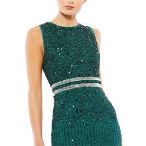 MAC DUGGAL SLEEVELESS HIGH NECK BEADED MIDI SHEATH DRESS
