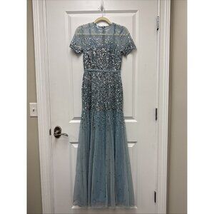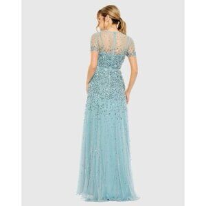 MAC DUGGAL Size 2 Slate Blue HIGH NECK SHORT SLEEVE SEQUIN EMBELLISHED DRESS