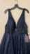 This beautiful ball gown features a shimmering overlay and an open back. A ruched bodice with three beaded belts to support the plunging neckline and open back. This glitter tulle prom dress is completed with a fully gathered skirt that flares to a sweep train.