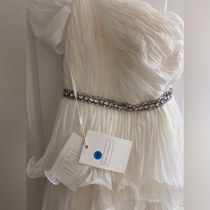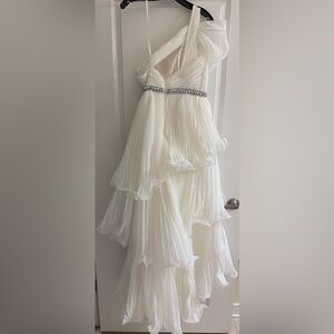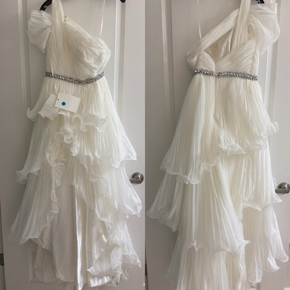 NWT 450 MAC Duggal white one-shoulder tiered ruffle dress with a beaded waistline.