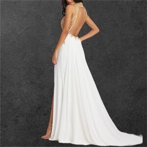 MAC DUGGAL Women’s Cassandra Stone by Mac Duggal Floral Beaded High Neck Open Back Gown in the Size 2 in Ivory/Gold