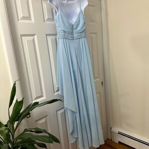 Sleeveless chiffon maxi dress with ruched draped v-neckline, spaghetti straps, and a flowy asymmetrical high low ruffle hem.