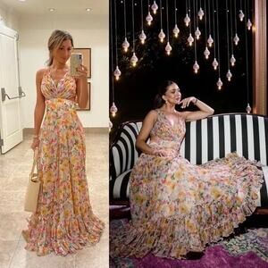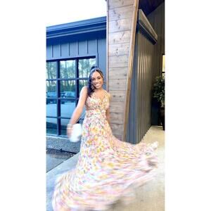 MAC DUGGAL Yellow Floral Chiffon Gown is a breathtaking, elegant piece, featuring a flowy chiffon fabric adorned with a vibrant yellow floral print. The gown likely has a floor-length design, perfect for formal events or special occasions. One of its standout features is the lace-up tie back, adding a sophisticated and customizable fit, while also offering a hint of delicate detailing on the back.