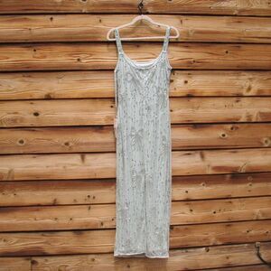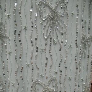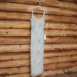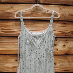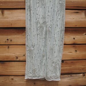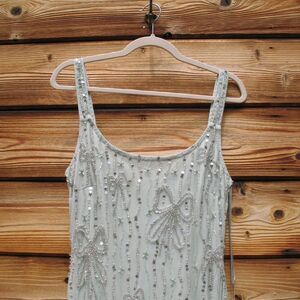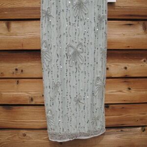 This dazzling gown features embellished mesh fabric with a scoop neckline and sleeveless design. Delicate spaghetti straps and a beaded bow design throughout add a unique touch, while the allover sequin pattern creates a glamorous, sparkling effect, making it perfect for any special event.