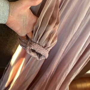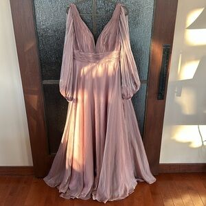 This stunning Mac Duggal dress is perfect for any formal occasion. The mocha color and chiffon fabric give it an elegant and sophisticated look. The dress features a V-neckline, long sleeves, and a zip closure. It has a fit and flare style with options for maxi, ball gown, A-line, and blouson. The size is a regular 10. Perfect for weddings, parties, or cocktail events.