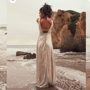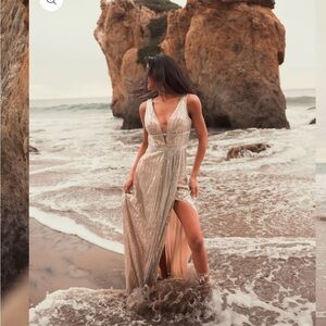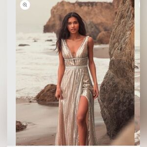 Stunning gold sequin gown with a deep V-neck. Features a high slit for added elegance. Perfect for formal events.