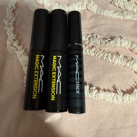 Set of 3 MAC Magic Extension and Stack mascaras. Sleek black tubes with bold branding.