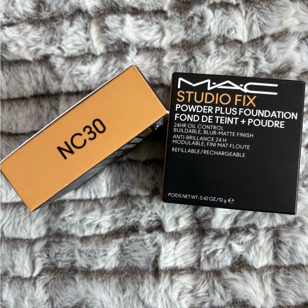 MAC Studio Fix Powder Plus Foundation in shade NC30. Offers a buildable, blur-matte finish. Ideal for a flawless look.