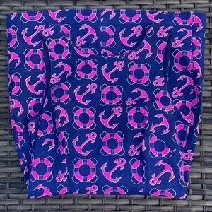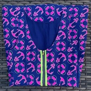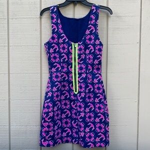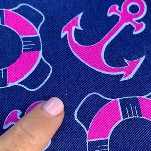 Super fun nautical sheath dress made of almost a denim material featuring a hot pink and white life preserver and anchor print. Exposed gold toned back zipper trimmed in lime green grosgrain ribbon. Vertical and princess darts through bust snd torso for a perfectly fitted look. Material does have some stretch and is fully lined.
