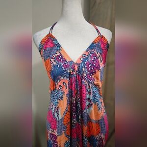 Eye-catching dress with a lively mix of patterns. Features bright shades of orange, blue, and pink.