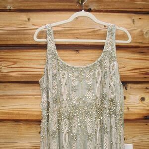 Adorned with allover beading and hanging crystals, this dress is the epitome of effortless glamour. Featuring a sleeveless design, scoop neckline, and flattering silhouette, it's the perfect look for weddings, cocktail parties, or any special occasion.