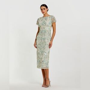 This soft sage cocktail dress shimmers with all-over pearl, rhinestone, and sequin beading. Its delicate sparkle and graceful silhouette create an effortlessly magical, ethereal look—perfect for weddings, parties, or evening events.