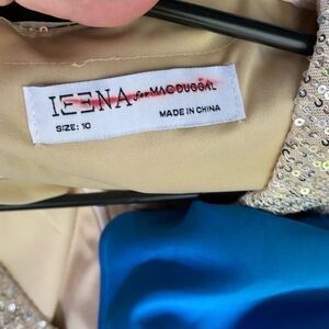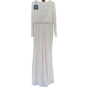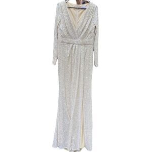 Long sleeved fully sequined evening gown accented with a ruched waist and thigh-high front slit.