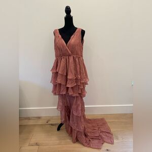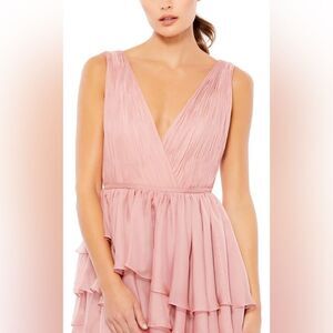 Gorgeous and classy, this Mac Duggal 55320 creation is something that you cannot miss! Topped with a bold plunging V-neckline, the fully lined dress shows off a wrap-style, sleeveless bodice with ruching detail throughout. Just below the nipped waistline, the dress transforms into a ruffled gown, which reveals tulle tiers and intricate pleats all over as it flows to the high-low hemline.