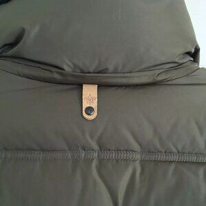 Details: dark army/khaki green shade, high collar with black shearling accent, full front zip & hidden snap closure, leather pull w/designer logo, black leather trim along zip, black lambskin leather sleeves w/zip cuffs, 2 front zip slant pockets, 2 flap front pockets w/snap buttons, duck down & feather filled, fully lined, mid-heavy weight. No scratches on leather. Note: Missing hood. Tiny stain on front right pocket (last pic). Overall gorgeous!!!