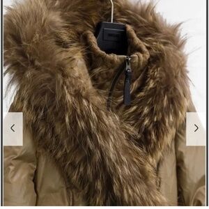 featuring a knitted collar and cuffs, a double front zip closure, black leather trims at the zip pockets and exterior front zipper, and a hood that flaunts Asiatic raccoon fur trim that plunges down the chest.