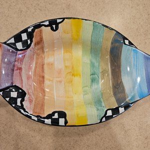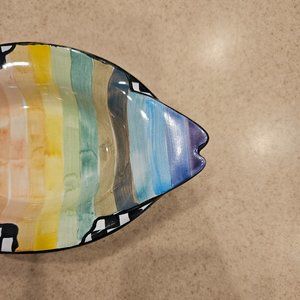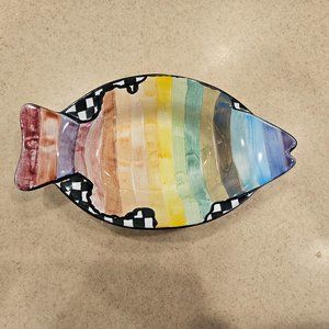 This is an AUTHENTIC RETIRED MACKENZIE CHILDS STRIPED RAINBOW FISH SMALL DISH. RARE! This is RETIRED and NO LONGER AVAILABLE. DELIGHTFUL Rainbow striped design on this dish! This is ceramic and HANDMADE in Aurora, NY and HAND-PAINTED. This was purchased directly from Mackenzie Childs. CLASSIC and WONDERFUL addition to any table!! The dish measures approximately 7 7*8"L (from end to end) by 4 1/8"W (at widest point) by 1 1/4"H. Hand washing is recommended. These are NOT Dishwasher safe nor microwave safe. Comes from a non-smoking home. Due to the handmade nature of these pieces, they may vary.