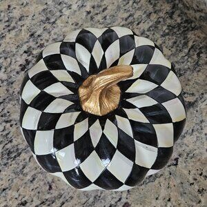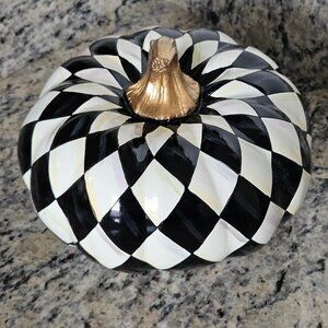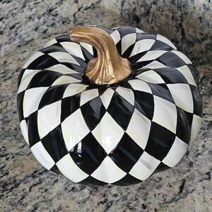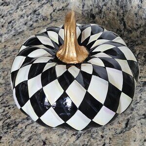 This is an AUTHENTIC RARE MACKENZIE CHILDS SQUASHED HARLEQUIN COURTLY CHECK PUMPKIN. VERY RARE! The Harlequin Pattern Courtly Check Pumpkin is a spooky celebration of the classic combination of white and black. LOVELY CLASSIC squashed design in white and black in harlequin check patterned with a touch of gold for the stem accents this LOVELY pumpkin! This was purchased directly from Mackenzie Childs. CLASSIC and WONDERFUL addition to any decor or kitchen!! Add a seasonal staple with touch of glitz to your Halloween decor and this gorgeous gourd a seasonal staple right thru Thanksgiving. Measures approximately 5 3/4"L (from top to bottom) by 7"W (at widest point...from left to right) by 7" deep (at deepest point.) Made of resin. Due to the hand-made nature of these pieces...each may vary. Imported. Wipe with a soft, damp cloth. Comes from a non-smoking home.