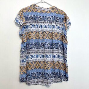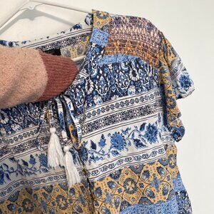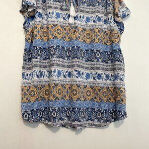 MACKENZIE JAMES Plus Size Blue White Floral Striped Boho Tie Neck Peasant Blouse