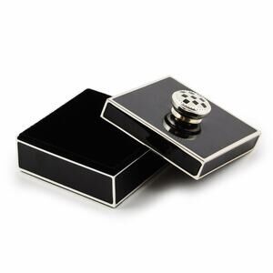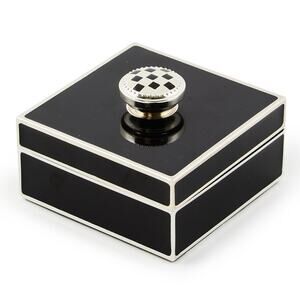 Store your keepsakes in this trinket box, featuring an enameled black coating on silver plate, lined with velvet and topped with a check knob. It’s presented in a box for easy gift giving.
