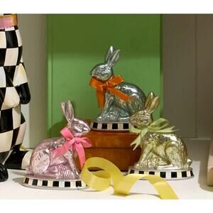 Add a playful touch to your Easter décor with this MACKENZIE-CHILDS Calico Mini Foil Easter Bunnies Set! This adorable 3-piece set features resin bunnies in shimmering pink, green, and blue foil finishes, each adorned with a sweet bow around the neck and set on a Courtly Stripe base. Measuring 1.75" W x 3.5" L, these decorative bunnies are perfect for tabletops, shelves, or festive displays.