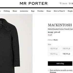 Mackintosh's 'Oxford' coat was handcrafted in Scotland by one skilled artisan, who worked on it from start to finish. A streamlined version of the original, it's made from water-repellent bonded cotton with hand-finished taped seams and concealed button fastenings. It has a handy slip pocket inside for your smartphone and an internal tab to attach one of the brand's liners.