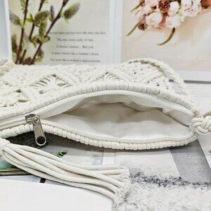New in original packaging. Macrame bag is a gorgeous handmade work of art. Inner lining, zipper closure, braided shoulder strap.