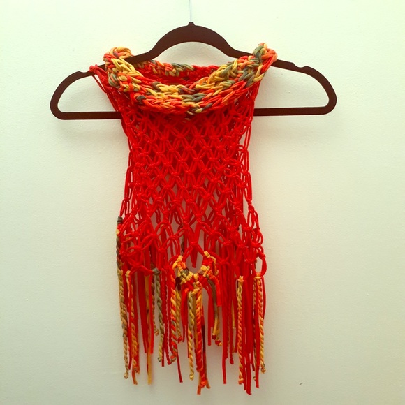 Formally a plain red t-shirt, cut, knotted, fringed, & collared with a touch of tie-dye.