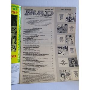 This listing is for MAD Magazine issue number 244, dated January 1984. This vintage comic book features a satirical and humorous take on various topics, including sections titled "Warped Games," "Psycho II," and "9 to 5," among others. The cover art is by Richard Williams, showcasing his detailed and comedic style. Inside, the magazine includes multiple departments such as the Absurd-Of-Mouth Department, Bet It Like It Is Department, Don Martin Department, and more, offering a broad range of comedic content.