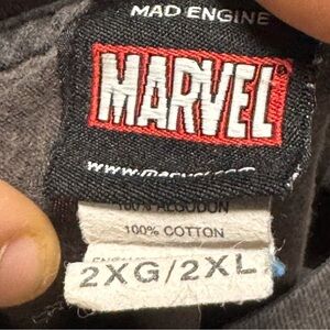 Bold Marvel logo on a MAD Engine t-shirt. Ideal for fans. y2k