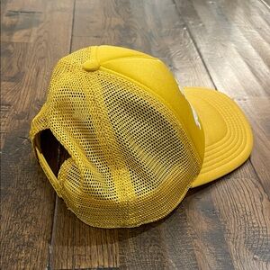 Goldish yellow truck hat with 'Not My First Rodeo' text. Mesh back & SnapBack. Stylish and bold.