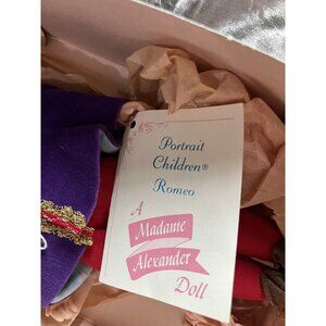 This Madame Alexander doll is a 12-inch portrait of Romeo, from the Portrait Children Series. It is a single unit, and comes with clothing and accessories. The doll is made of plastic and is an original, licensed reproduction. The packaging is original and has been opened. The doll's gender is male, and it is a boy doll. The model is Romeo, and it was manufactured in the United States. This doll is a great addition to any collection, and is perfect for fans of Madame Alexander.