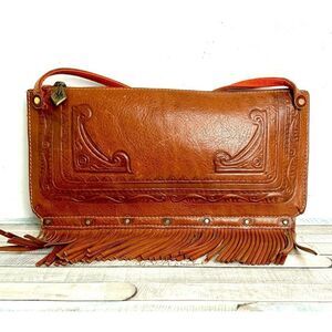 MADDALENA MARCONI ITALY TAN GENUINE LEATHER FRINGE SLIM SHOULDER BAG HANDBAG