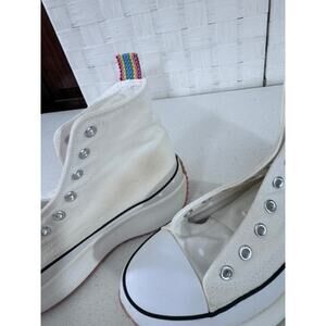 Unleash your style with the Madden Girl high top shoes, a perfect blend of comfort and trend-setting design. These white platform sneakers offer a bold statement with their unique discolored-browning aesthetic, making them a standout addition to any outfit. Crafted for women who wear a US size 7, these shoes feature a no-lace design that allows for easy slip-on convenience. The elevated platform sole not only adds height but also provides a comfortable stride. Whether for casual wear or making a statement at a trendy event, these Madden Girl high tops are a versatile choice.FINAL SALE!!!!