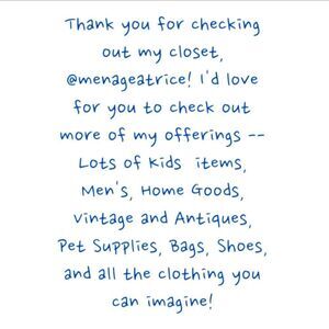 Do you know how to bundle? I offer 15% off every item if you buy two or more items from my closet! You also only need to pay shipping ONCE on a bundle -- up to 5 lbs per order. It’s a win-win! To bundle, tap on the shopping bag icon under each item you’d like. Posh will combine all those items into a single bundle, automatically deduct the 15% discount, and combine the shipping. If you send me a bundle, I will offer an even higher discount to you!