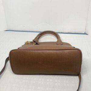 5” double rolled leather handles20” non adjustable but removable shoulder/crossbody strap