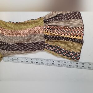 Made In Italy long bell sleeve, v-neck with buttons layered skirt mini dress, Patterned fall colors, 100% viscose. One Size, please check measurements.