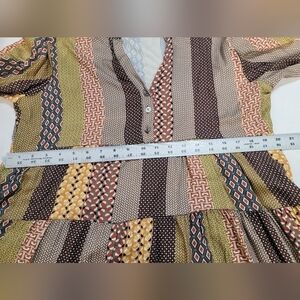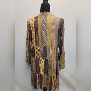 Made In Italy long bell sleeve, v-neck with buttons layered skirt mini dress, Patterned fall colors, 100% viscose. One Size, please check measurements.