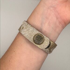 This is such a cool bracelet! Made by “Made in The Deep South”, this bracelet is a leather band with white and gold cowhide details, and the bracelet features a unique piece of vintage rhinestone jewelry! All of the pieces from this brand have a vintage touch, and this one has a piece from what looks like the 1950’s.