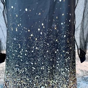 Knee length splatter paint dress. Long sheer sleeves with shinny bits.No zippers to worry about, just slip on. Size L, NWT.