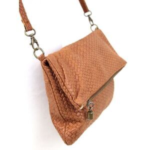 MADE IN ITALY TOOLED TAN BROWN GENUINE LEATHER X-BODY CLUTCH SHOULDER BAG PURSE