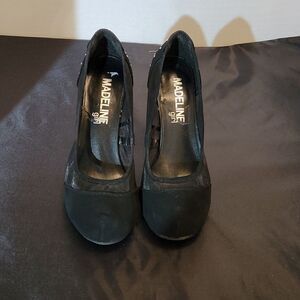 MADELINE GIRL BLACK HIGH HEEL PUMP SHOES SIZE 61/2M SHEER BLACK LACE TO BOTH SIDE AND SUEDE EFFECT, METAL APPLICATIONS SOLID COLOR NARROW TOELINE STILETTOS HEEL LINING RUBBER SOLE HAND-CRAFTED WORKMANSHIP THIS ITEMS IS PRE-OWNED EXCELLENT CONDITION WITH ONLY LIGHT SIGNS OF WEAR IF ANY CHECK THE PICTURES (FYI THE PICTURES IS JUST A MODEL TO SHOW WHAT THE SHOE LOOK ON CHECK THE PICTURES
